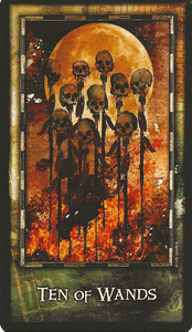 Thus, the Ten of Wands is both culmination and conclusion — the full weight of Fire now borne to its densest expression. Here, the elemental energy has run its course: the passions that once ignited creation now press down with the heaviness of completion. Yet this oppressive weight is also a sign that the cycle is ending. Like a fire that has consumed all available fuel, the burden will soon burn itself out, clearing the way for a new spark and a new creative current to rise.